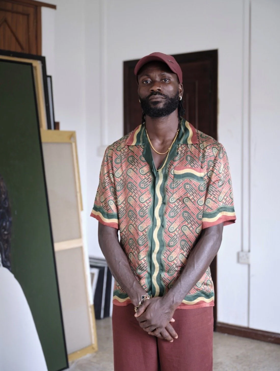 Amoako Boafo in his studio, Accra, 2025. Artwork © Amoako Boafo. Photo: Nii Odzenma
