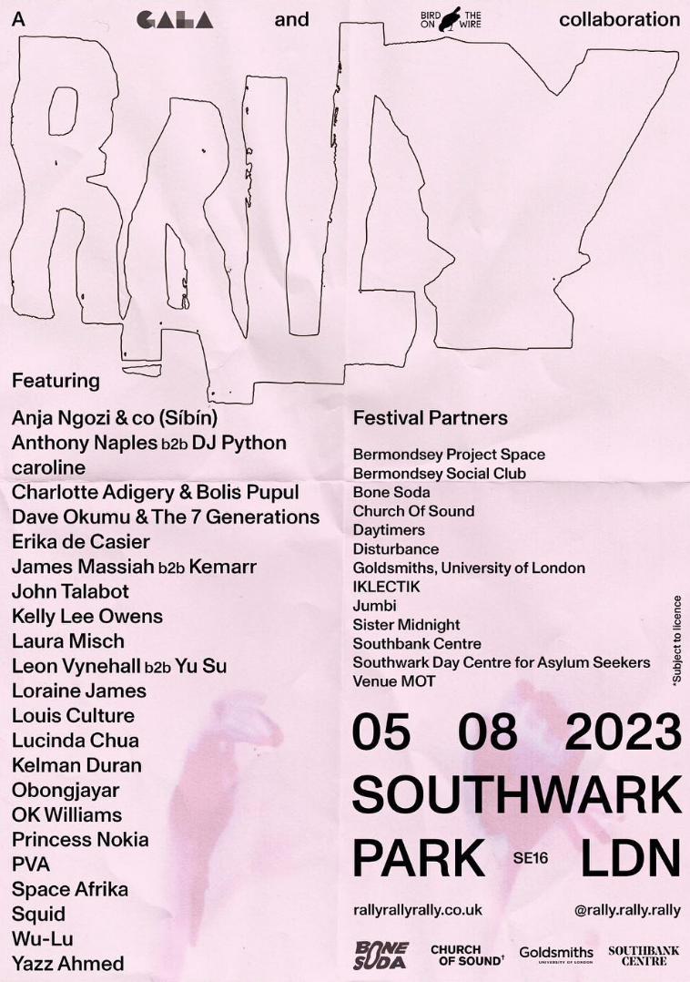#FLODown: RALLY is a new day event that will debut late in the 2023 festival season in South London's Southwark Park. The festival is a collaboration between organisers of the GALA festival and acclaimed promoters, Bird On The Wire. It aims to bring together some of the capital's most esteemed music and art communities, creating a space for the city's fundamentals in the musical landscape. The festival offers an accessible experience with a diverse genre line-up including Princess Nokia, Obongjayar, Squid, PVA, Kelly Lee Owens, John Talabot, Charlotte Adigery, Bolis Popul, and Wu-Lu.