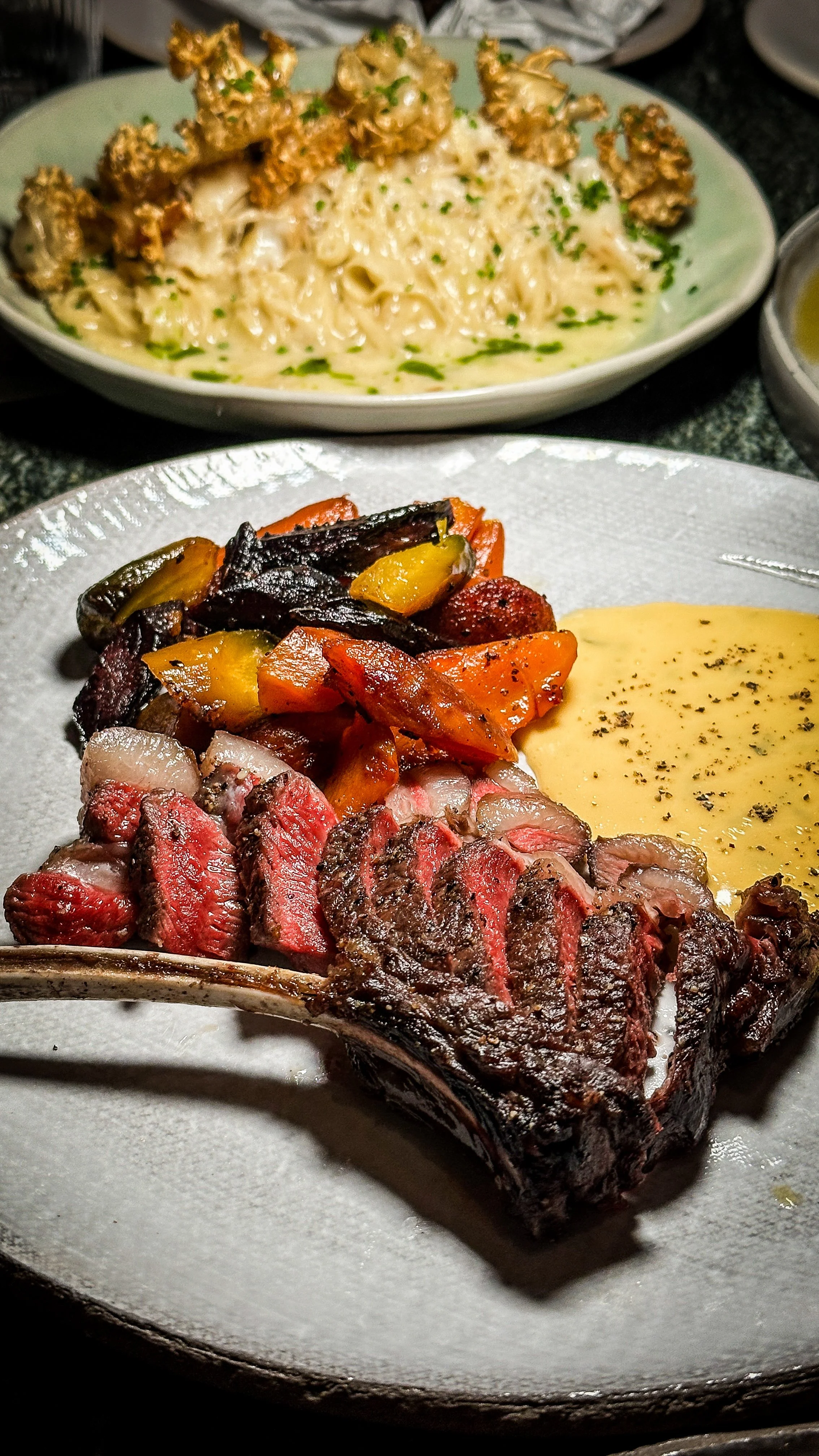The hearty dishes of pork chop from Cherry Hill in Berkshire with parsley cream and Windsor apple salsa and Seared Octopus with Merguez Sausage and Chickpeas are both must haves. But as we go into game season it would be remiss of me not to mention the Venison Tomahawk of earthy flavours and refined rusticity served with glazed carrots and Oregano Bearnaise. For vegetarians the Freekeh Spaghetti with leeks, cauliflower mushrooms and Spenwood cheese from Village Maid, Berkshire and Okra; smoked labneh, tomatoes, kadosh cheese were standouts.