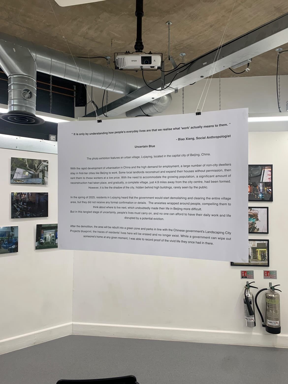 In the Uncertain Blue section, the images suspended on fishwire were an inspired choice. Lau’s intuitive approach created an ethereal, gently shifting atmosphere that mirrored Lujiaying’s own fragile, fleeting history. This setup also encouraged viewers to move behind the veiled images to discover a ‘hidden’ section, a glimpse into the stark reality of China’s housing crisis. The addition of video footage alongside the archival photographs was an intimate touch, allowing the audience to be fully immersed in China while still standing in the UK.