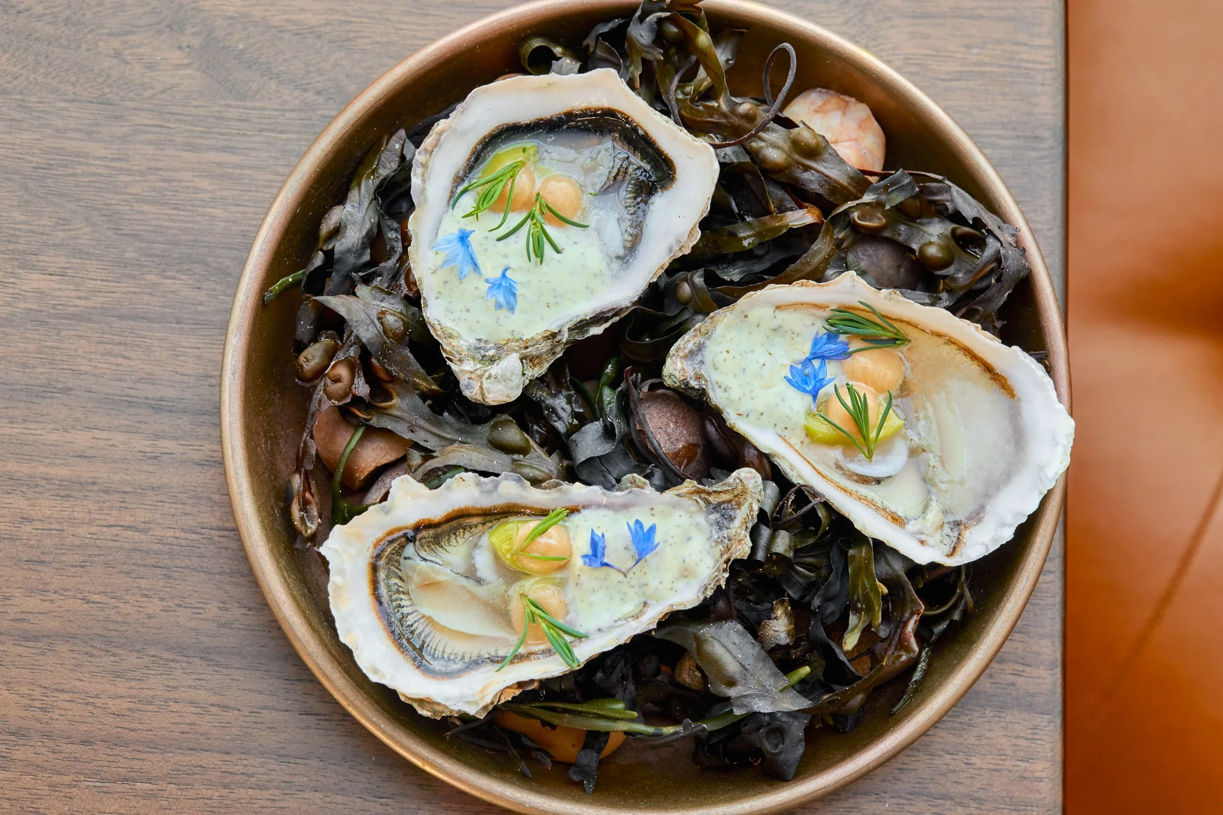 Upon entering the reception of the building housing the restaurants, we were cheerily greeted by name (always a nice touch) and accompanied up the lift and then through The Porter’s Table restaurant occupying two floors to get to the next lift leading to the roof top. It feels oddly complicated, but someone is there to guide until the lift opens into a spacious room with a central bar for drinks or counter snacking. Along the bar’s back wall is a small kitchen pass and a seafood display with rows of oysters, prawns and lobsters reflecting the menus seafood focus.