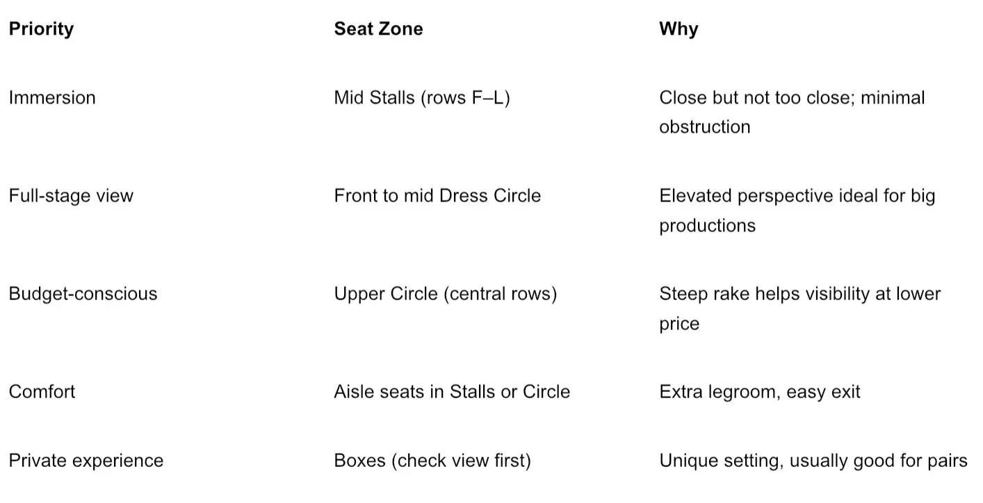 Budget vs. Experience: A mid-priced seat in the Circle can sometimes beat a cheaper Stalls seat under an overhang.