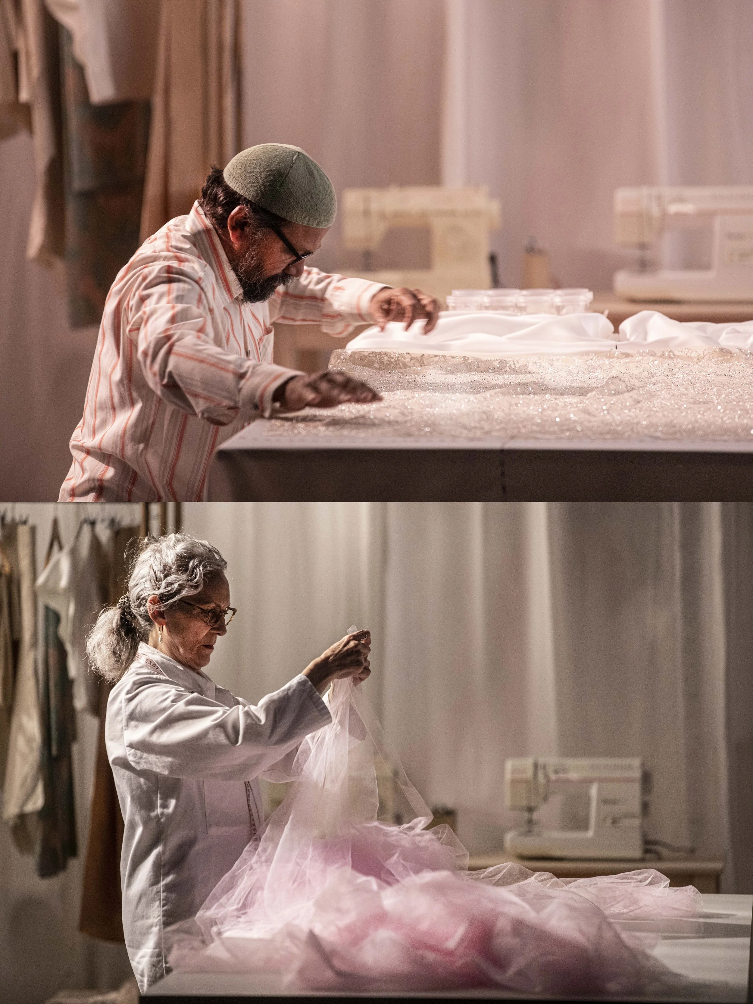Marion (Maud Le Grevellec), the head seamstress in Paris, is trapped in an abusive marriage to jealous, manipulative Julien (Dan Artus), who works beside her in the atelier. In Mumbai, Abdul (Charles Vinoth Irudhayaraj) labours day and night hand-stitching pearls and beads, unknowingly causing permanent damage to his eyesight. The owner of the tailors (Vasanth Selvam), who employs Abdul, battles with the strict international rules on labour and working conditions that govern the dress’ creation whilst also being asked to produce enormous amounts of work to meet the palace’s tight deadlines.