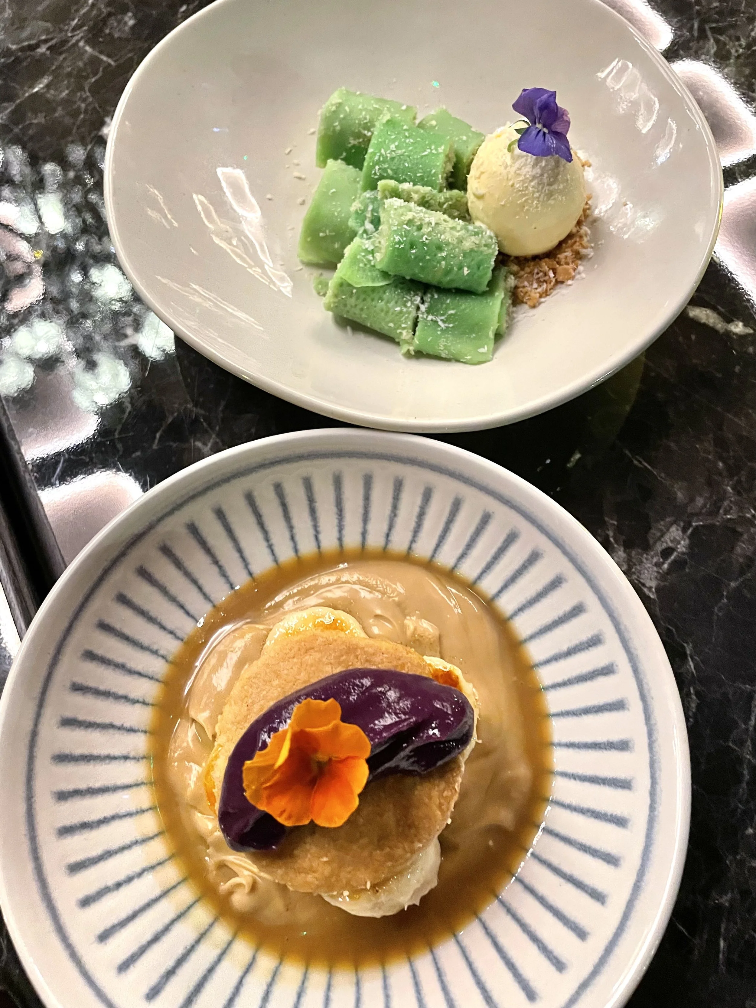 The deconstructed Kolak Pisang and the Dadar Gulung, Le Nusa, Strand, London. Image credit MTotoe/ FLO London