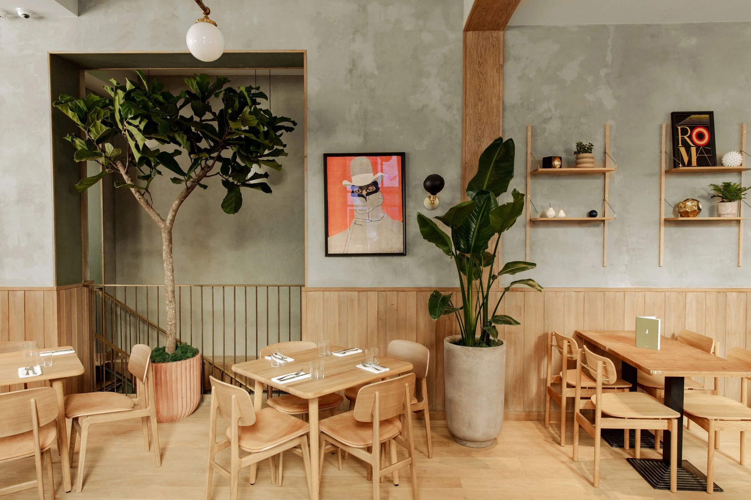 The restaurant has a Scandinavian feel to it, with clean lines, muted colours, and pale woods that create a calm, understated atmosphere - the perfect balance between modern & homey. Warmth comes from the honey-leather banquettes and lush potted plants lining one side of the room. Designed to work beautifully in all weather, the space is flooded with natural light thanks to large windows on two sides, which make it feel light and airyall year-round. When the windows are opened, you almost feel as though youโre sitting outside, seamlessly connected to the wraparound terrace, complete with heaters and a sleek grey-and-white retractable awning.It does get a touch loud when the restaurant is busy, but tables are well spaced, which helps.
