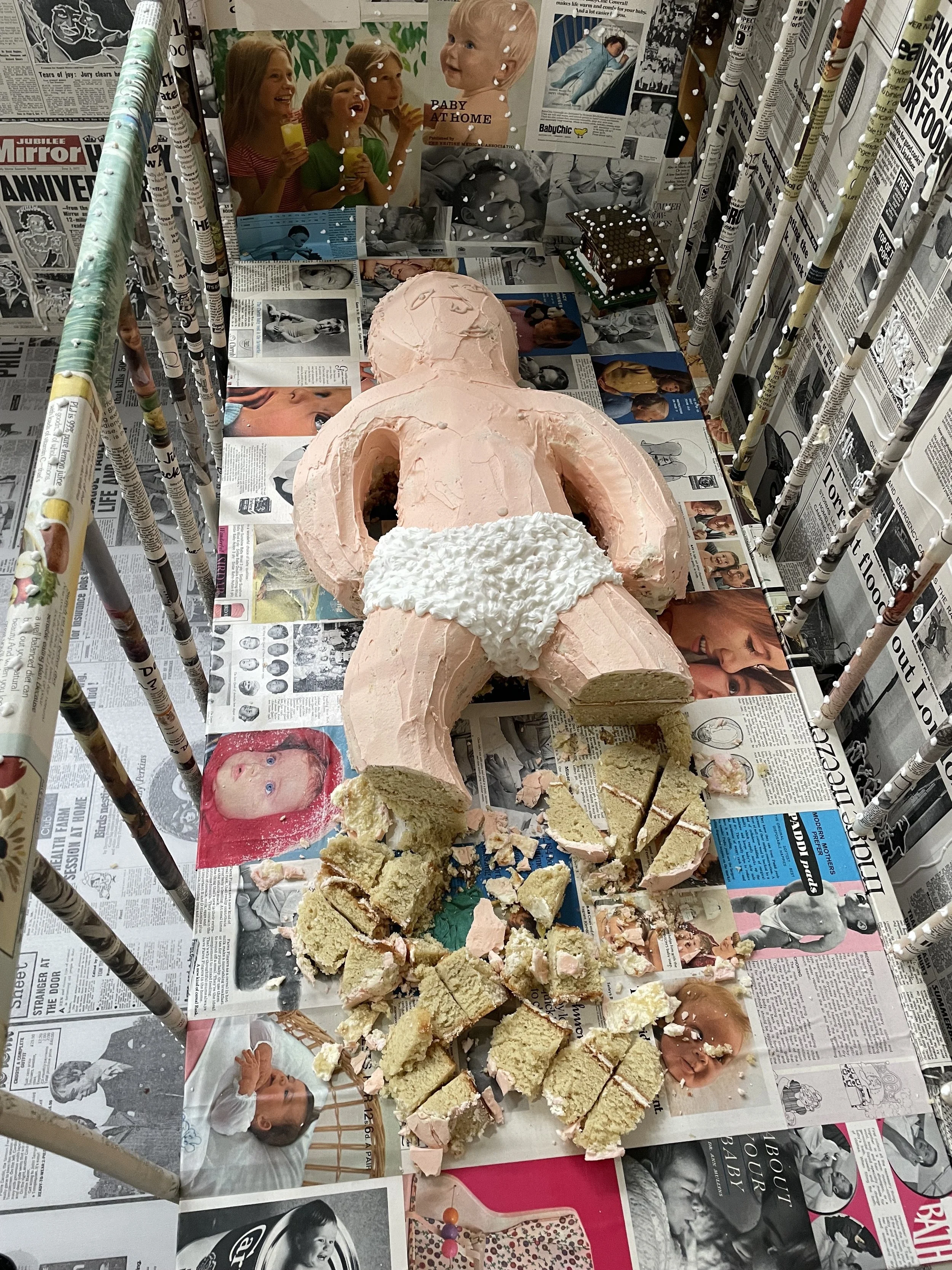 This weekend, Bobby Baker’s restaged An Edible Family in a Mobile Home returns to Tate Britain as part of the Women in Revolt! Art and Activism in the UK 1970-1990 exhibition. Initially staged in 1976 in her own home, visitors were invited to consume sculptures of a family alongside cups of tea while Baker portrayed the role of a gracious host. These life-sized family members, crafted from edible materials such as cake, biscuits, meringues, and snacks, adorned the rooms of her prefab house, offering a unique and immersive experience.