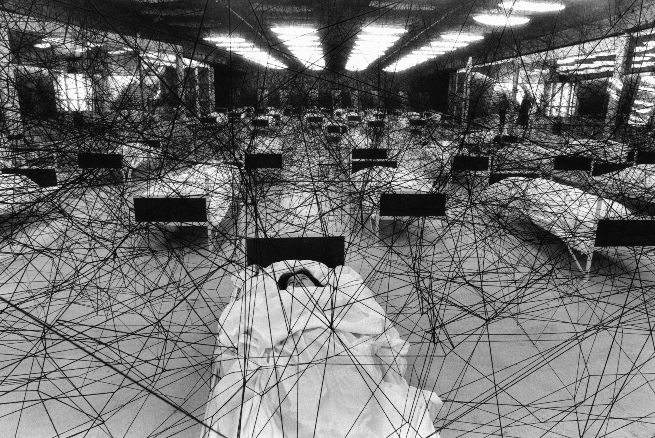Shiota, Breathing from Earth, 2000 Performance/Installation: metal beds, bedding, black wool Kunstraum Maximilianstrasse, Stadtforum München, Munich, Germany. Image credit by Sabine Klem