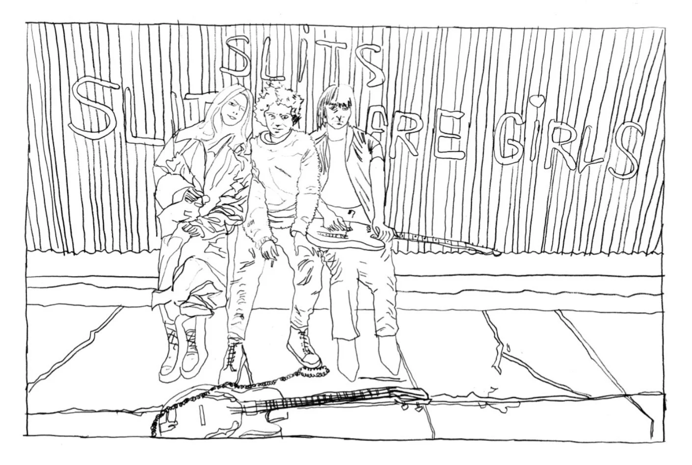 Ângela Ferreira: Drawing of The Slits, 2025. Based on a photograph by Julian Yewdall, 1977 in Daventry Street London, NW1, where the band rehearsed in a squat. Left to right: singer Ari Up, drummer Palmolive and guitarist Kate Korus. [Missing from original photo: Tessa Pollitt, bass and Viv Albertine, who would replace Kate Korus on guitar]