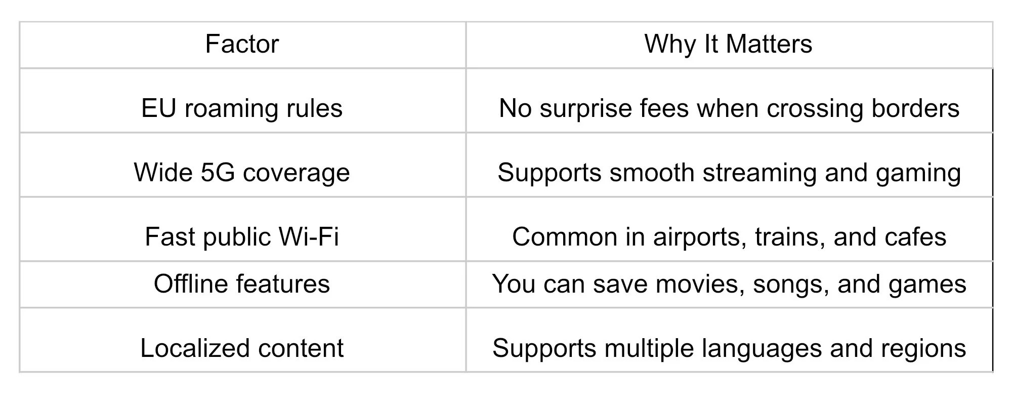 Europe makes mobile entertainment pretty easy for travellers. Good networks, clear data rules, and plenty of offline options help you watch, play, or read without any hassle. Here’s a quick look at what improves the experience: